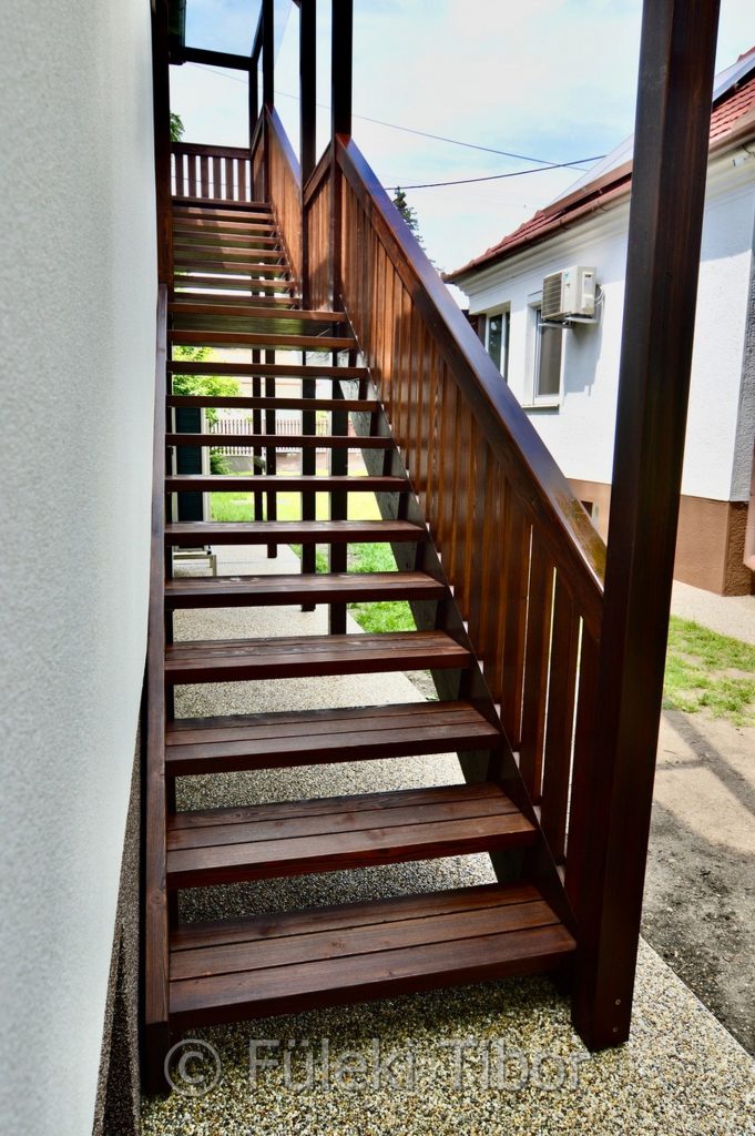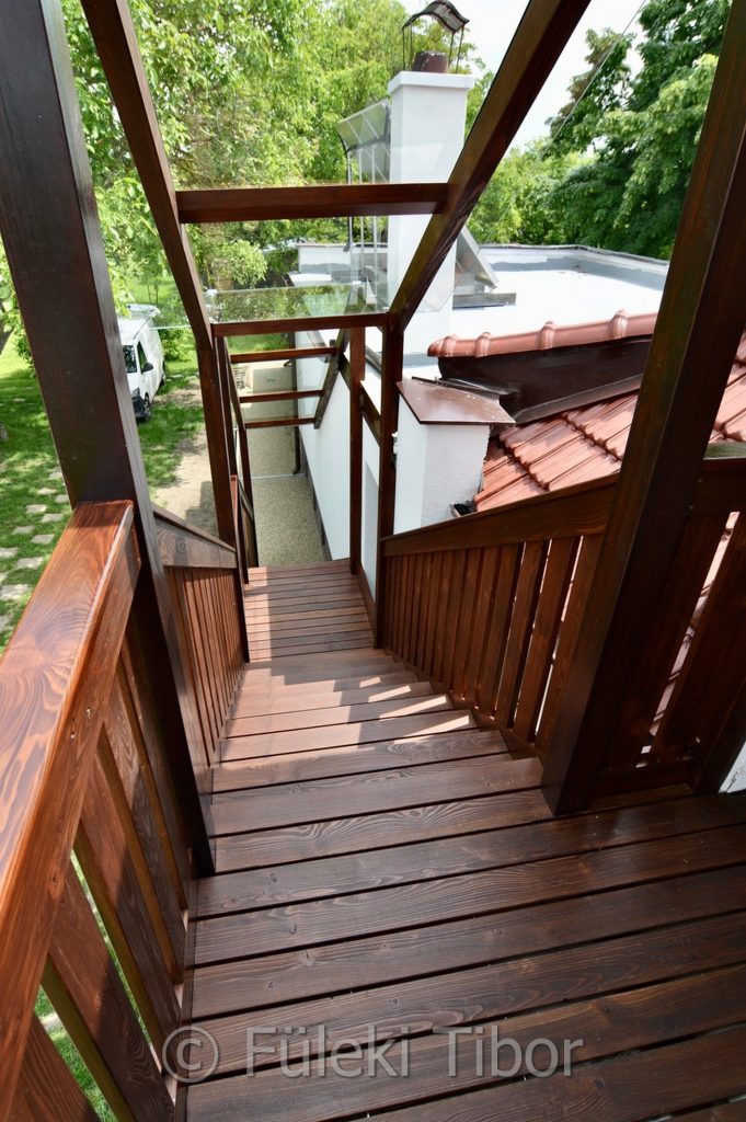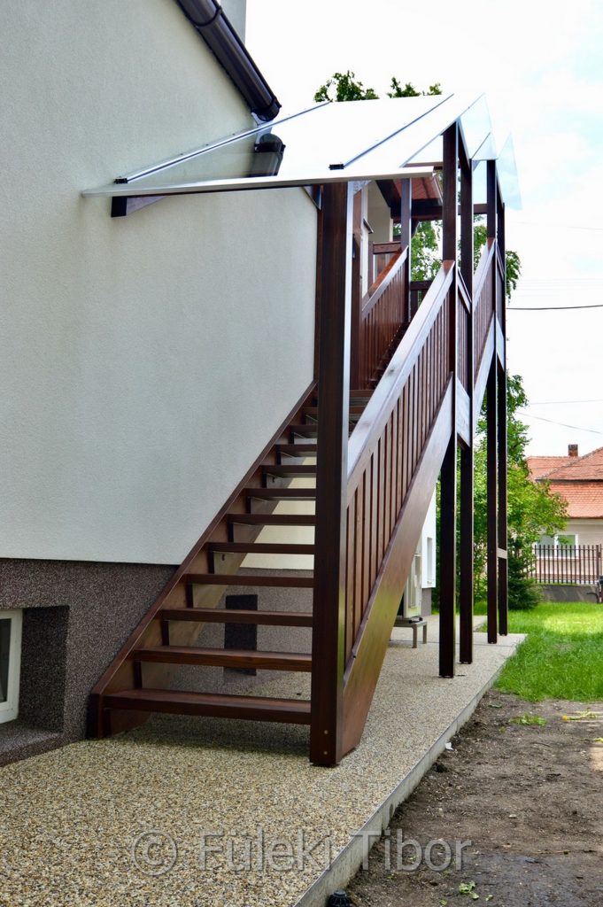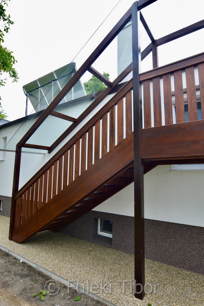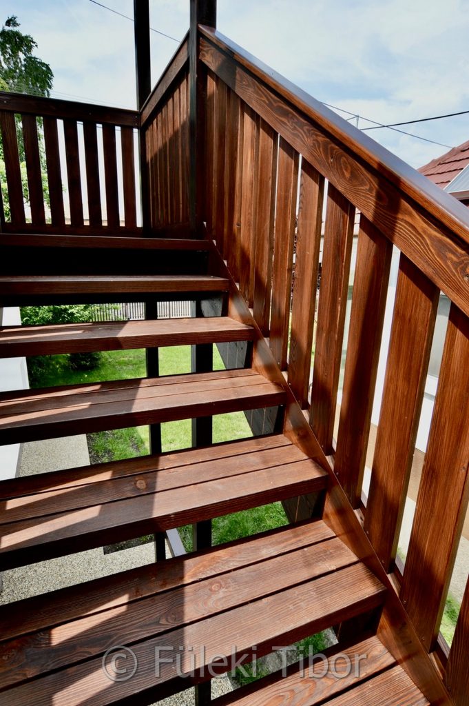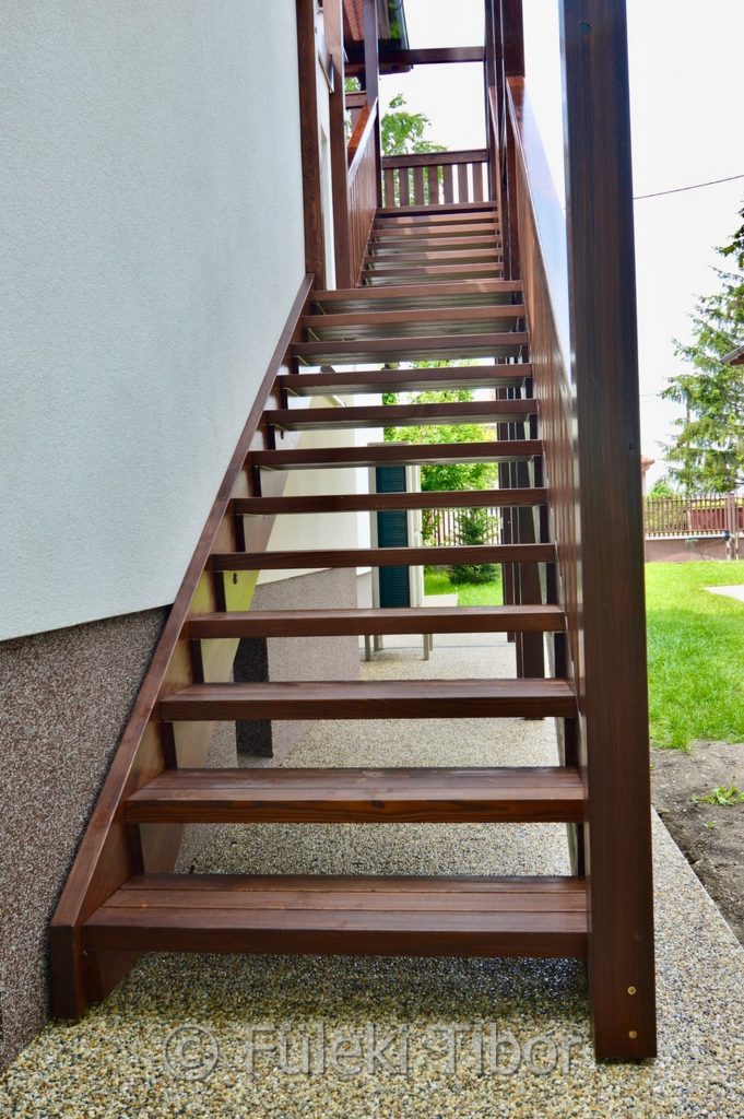 Nagyon ritkán, de készítünk kültérre is lépcsőt fából. Erre a legjobb anyag a hazai fafajok közül a vörösfenyő. Fontos, hogy ha csak lehet tető alá kerüljön a kültéri fa szerkezet. A jó minőségű felületkezelés is növeli a faanyag tartósságát, de a legfontosabb a szerkezeti kötések helyes tervezése. A csomópontokból a csapadék könnyen tudjon távozni, és gyorsan kiszáradjon még a legeldugottabb zug is.