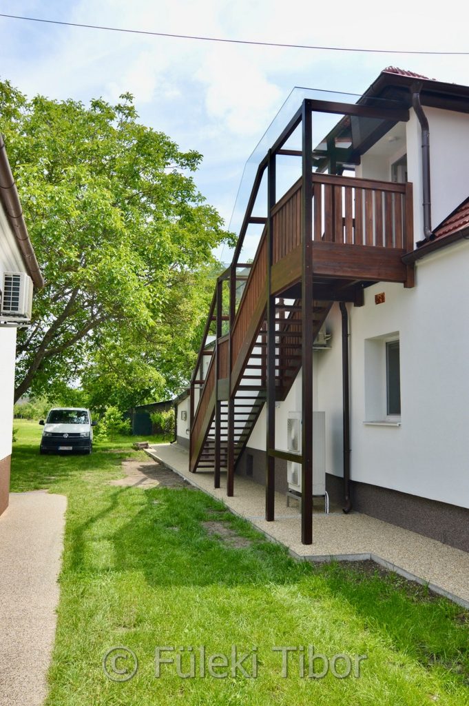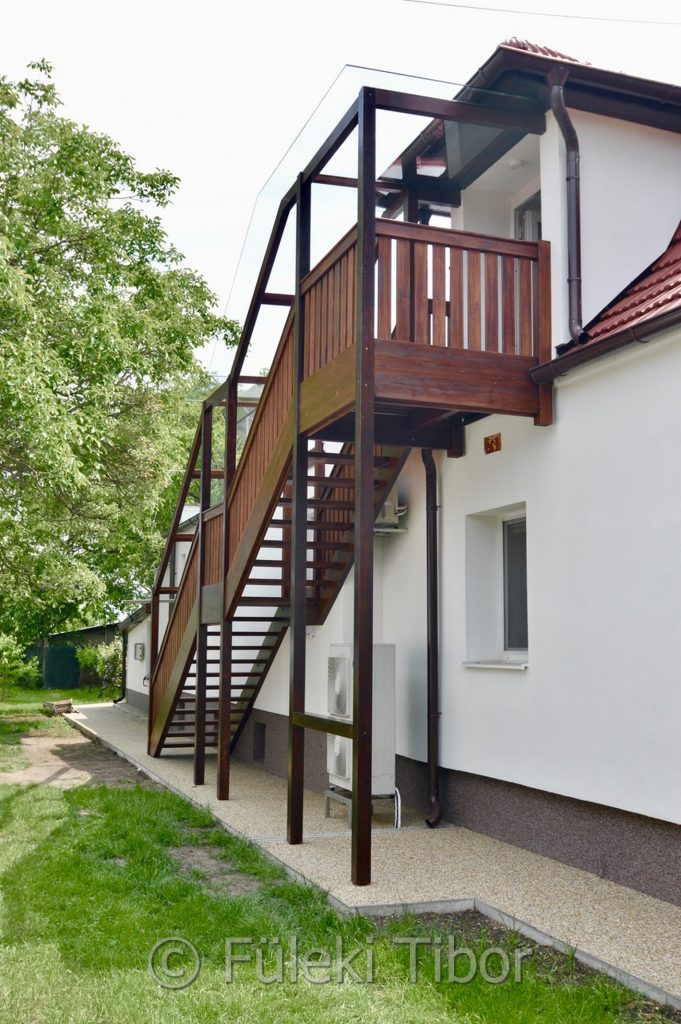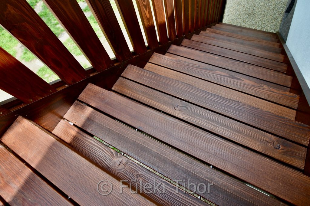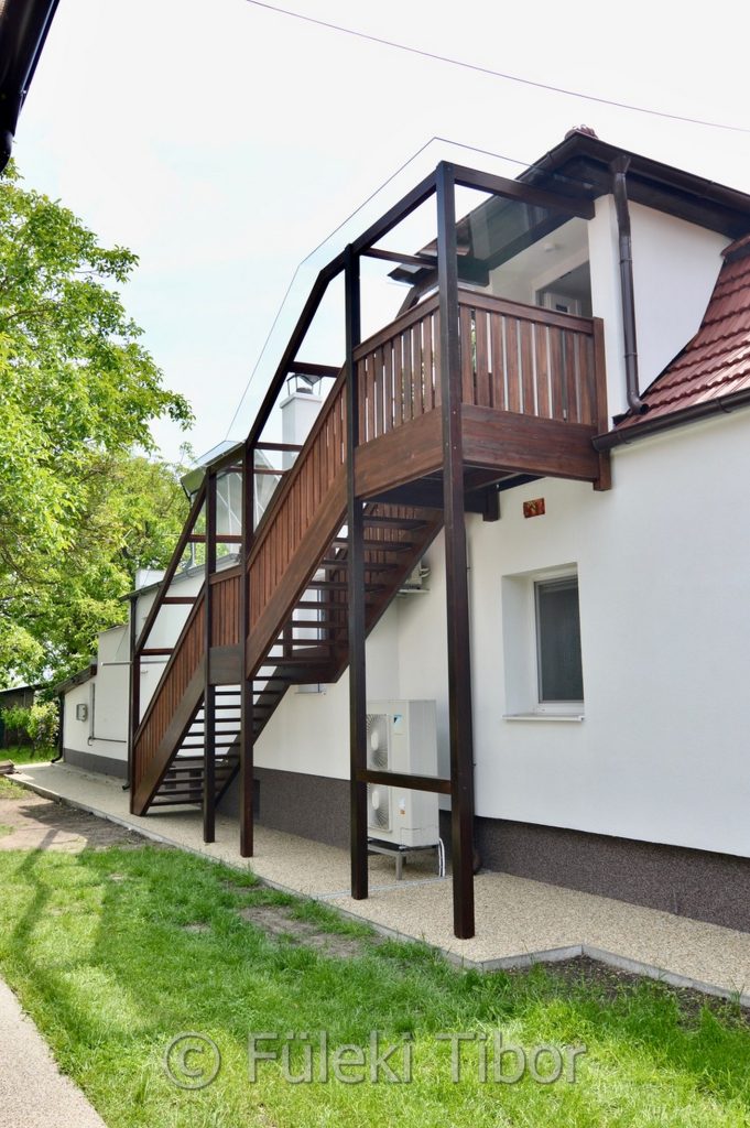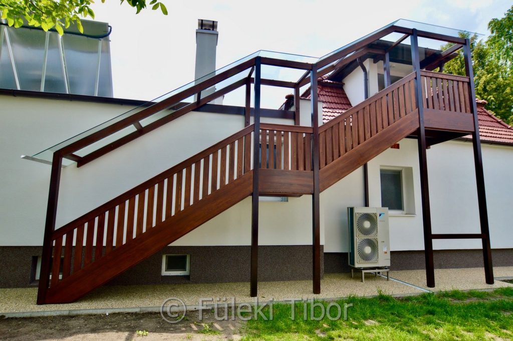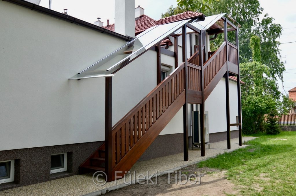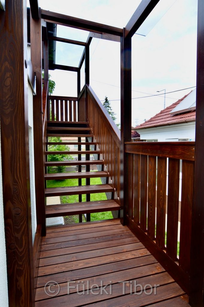 Nagyon ritkán, de készítünk kültérre is lépcsőt fából. Erre a legjobb anyag a hazai fafajok közül a vörösfenyő. Fontos, hogy ha csak lehet tető alá kerüljön a kültéri fa szerkezet. A jó minőségű felületkezelés is növeli a faanyag tartósságát, de a legfontosabb a szerkezeti kötések helyes tervezése. A csomópontokból a csapadék könnyen tudjon távozni, és gyorsan kiszáradjon még a legeldugottabb zug is.
